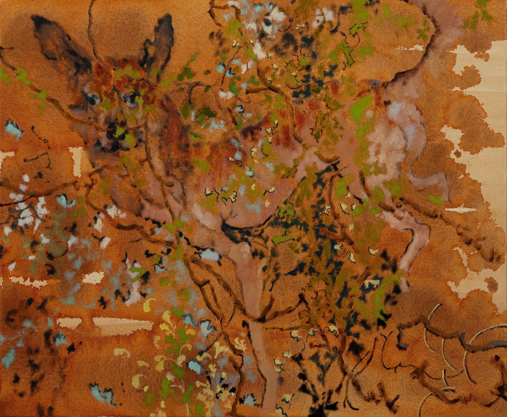 展覽中 Marshmallow Laser Feast 的〈Poetics of Soil: Fly Agaric I〉(2024)以雷射掃描生成的點雲構成影像。畫面看似平淡,卻透過散點式影像與全景推軌鏡頭(circular dolly shot)緊扣旁白內容,緩緩勾勒出真菌釋放孢子、菌絲體在土壤中擴展的軌跡,帶出肉眼難以察覺的微觀生態與其中非人個體的緊密連結網絡。同場展出的 Marguerite Humeau 雕塑以天然蜂蠟、微晶蠟與胡桃木製作;其創作理念中提及的「樹木死因不明」帶著微妙的指向性,彷彿雕塑材料本身的香氣也在無聲牽引著觀眾進入樹木生態的空間構想。
